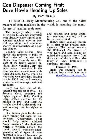 In order to get the financing needed to raise the $1.2M (Bally reports $2.85M) needed, Sam Klein was credited for bringing in Louis Jacobs and Emprise corporation to provide part of the financing for the acquisition of Bally. With funds from Emprise packaged with a loan from the teamsters union, the deal was put together and closed on June 17, 1963. Bill O’Donnell became Bally’s CEO, Sam Klein became Bally’s largest stockholder and a vice president and Abe Green and Irving Kaye were put on the Bally Board of Directors. Unfortunately prior to the close of the deal Barney Sugarman died unexpectedly and his interests were bought out by Green.